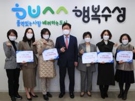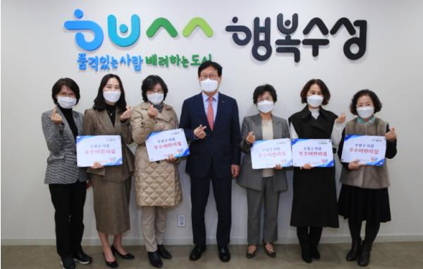 대구광역시 수성구는 지난 24일 평소 높은 품질의 보육환경을 유지하며 우수하게 운영하고 있는 지역 내 어린이집 5개소를 우수어린이집으로 선정하고 지정서와 현판을 수여했다.