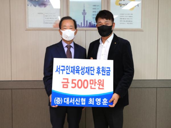 대구광역시 서구인재육성재단는 지난 23일 구청장실에서 서구인재육성재단 발전기금으로 대서신협에서 5백만원, ㈜제라에서 3백만원, ㈜명신환경로부터 2백만원을 기탁받았다.