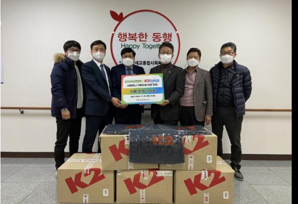 사단법인 오산시 호남연합회(대표 하동기)와 K2 오산MS점(대표 서용철)은 지난 24일 오산세교종합사회복지관(관장 강대봉)을 방문해 ‘사랑하나 기쁨두울 의류 전달식’을 통해 조끼 120벌(1,300만원 상당)을 기탁했다.