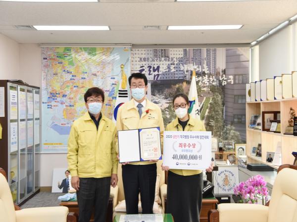 부산 남구는 지난 18일 행정안전부, 국무총리실, 인사혁신처가 공동으로 개최한 2020년 적극행정 우수사례 경진대회에서 국무총리상인 최우수상을 수상하였고 인센티브로 특별교부세 4,000만원을 받았다. 적극행정 사례 발굴 및 공직사회 확산을 위해 지난 2016년부터 개최한 적극행정 우수사례 경진대회로 올해는 코로나19 등 긴급한 상황에 선제적이고 창의적으로 대처한 사례가 큰 호응을 받았다.