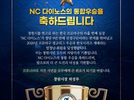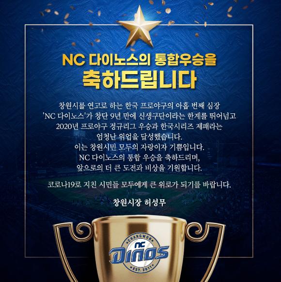 “창원시를 연고로 하는 한국 프로야구의 아홉 번째 심장 NC 다이노스의 한국시리즈 우승을 진심으로 축하드립니다.”