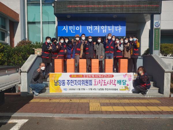 코로나19 확산으로 경로당 및 노인복지시설이 일시적으로 문을 닫아 끼니를 챙기기 어려운 독거노인들을 위해 남양동 주민자치위원들이 담당 마을별로 책임구역을 정하여, 매일 점심시간에 도시락을 전달해드리며 안부를 확인했다.