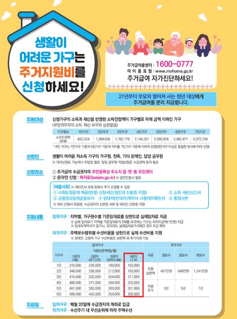 지원 대상은 주거급여 수급가구 내 만 19~30세 미만 미혼자녀로, 부모와 청년이 주민등록상 시·군을 달리하는 경우에 인정된다. 단, 같은 지역이라도 대중교통 이용 가능성이나 소요시간, 신체적 장애 등 부득이한 사유가 있다면 예외가 인정된다. 이와 관련 내년도 주거급여 선정기준은 △1인 가구 82만2524원 △2인 가구 138만9636원 △3인 가구 179만2778원 △4인 가구 219만4331원 등이다.