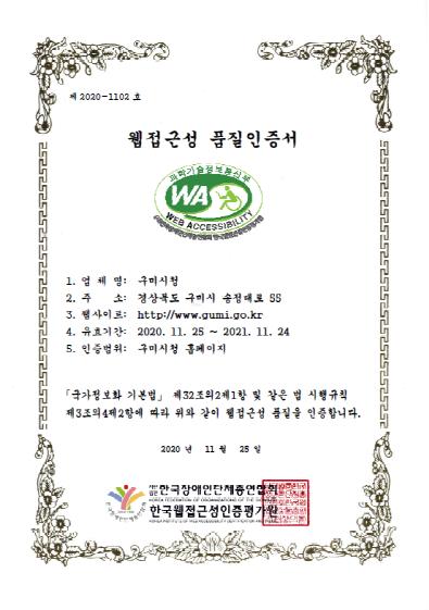 구미시는 11월 25일 과학기술정보통신부 지정 인증기관 '한국웹접근성인증평가원'으로부터 5년 연속 '웹 접근성 품질인증마크'를 획득하였다.