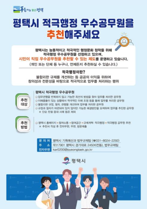 평택시는 지난 25일 ‘시민과 함께하는 적극행정?규제개혁’ 홍보를 위해 포스터 200부 및 리플릿 1,000부를 제작해 배부했다고 밝혔다.