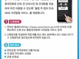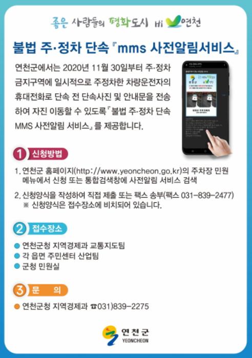이 서비스는 고정식 CCTV단속 카메라가 설치된 단속지역에 불법 주정차한 사실을 차량운전자에게 휴대폰 문자로 알려주는 서비스이다. 서비스 제공은 온·오프라인을 통해 사전에 신청한 대상자에 한해 제공되며 연천군 홈페이지 주정차 메뉴에서 가입하거나 지역경제과 또는 읍면 행정복지센터에서 방문 신청할 수 있다.