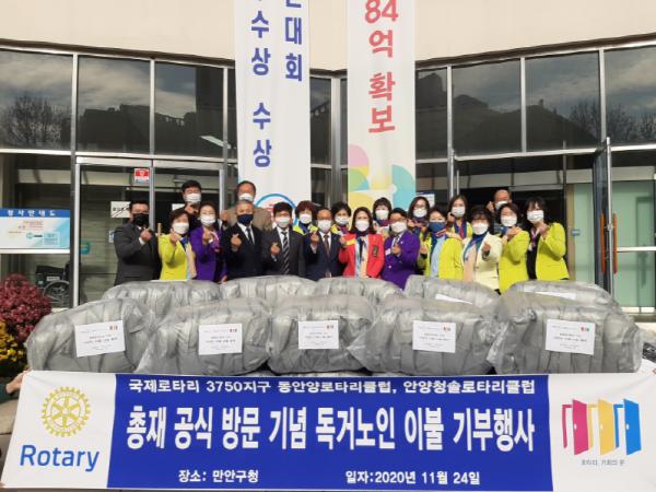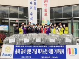 안양시는 청솔로타리클럽(회장 김금영)과 동안양로타리클럽(회장 홍용선)이 지난 11월 24일 만안구청에 4백여만 원 상당의 이웃돕기 월동 물품을 기부했다고 밝혔다.