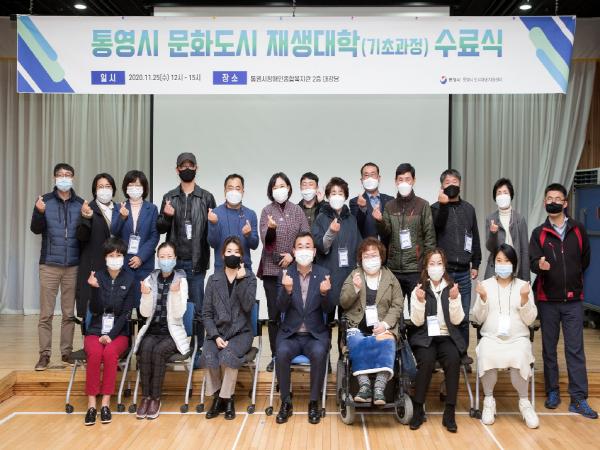 통영시는 11월 25일 통영시장애인종합복지관에서 강석주 통영시장, 지역구 시의원, 관계 공무원, 수강생 등 30여 명이 참석한 가운데 ‘통영시 문화도시재생대학(기초과정)’수료식을 개최했다.