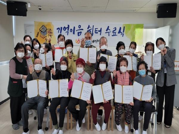 이날 수료식은 어르신들의 활동 영상 감상 및 수료증 수여 등으로 진행되었으며 쉼터 수료자분들께는 치매를 이겨내기 위해 자기주도적 학습과 건강관리를 이어나갈 것을 당부 드리며 인지교구(퍼즐)와 세라밴드·마사지볼 등을 지원했다.
