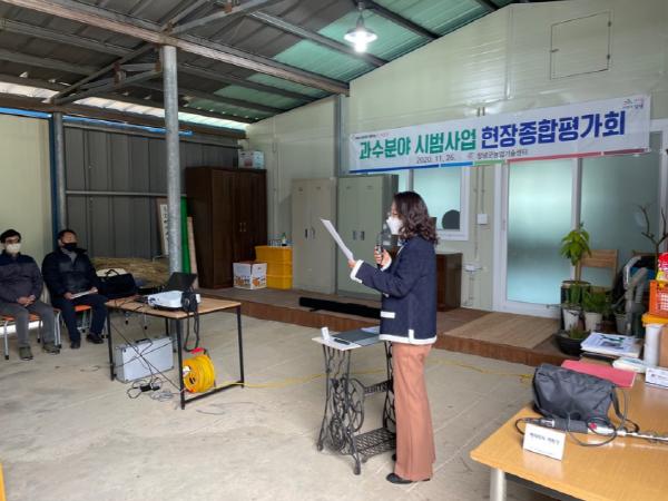 창녕군은 26일 창녕읍 퇴천리 소재 단감과원(농장주 김희덕)에서 과수분야 시범사업 참여농가가 참석한 가운데 2020년 과수분야 시범사업 현장 종합평가회를 개최했다.