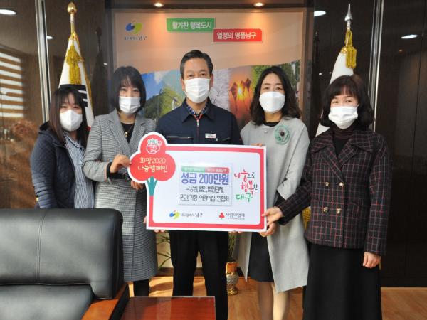 대구광역시 남구청은 지난 25일 오전 10시, 어린이집연합회에서 남구청을 찾아 어려운 이웃을 위해 사용해달라며 성금 2백만원을 기탁하였다고 밝혔다.