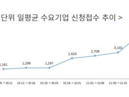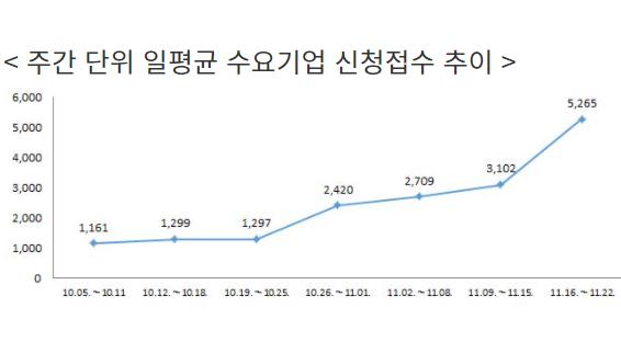 10월 첫째 주(10.5~10.11) 일평균 신청 1,161개에 비해 신청접수 마감일(11.23) 기준으로 가장 최근 일평균 신청은 5,265개로 약 5배 증가했다. 코로나 장기화 등으로 중소기업의 비대면 서비스 수요가 급증한 것으로 풀이된다.