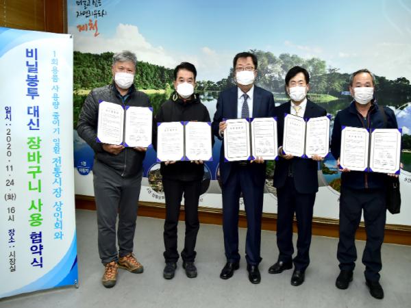 제천시가 1회용품 사용량 줄이기의 일환으로 관내 전통시장 상인회와 '비닐봉투 대신 장바구니 사용' 협약을 맺었다.