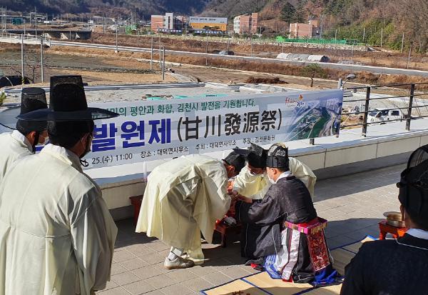대덕면은 지난 25일 대덕면사무소 2층 발코니에서 김천시민의 안녕과 번영을 기리며 2020년 감천발원제를 봉행했다. 이번 감천발원제는 김천을 흐르는 감천의 발원지인 대덕면에서 김천문화원 송기동 사무국장의 집례로 이원용 대덕면장이 초헌관, 이산걸 노인회장이 아헌관, 윤광혁 이장협의회장이 종헌관으로 참석하였다.