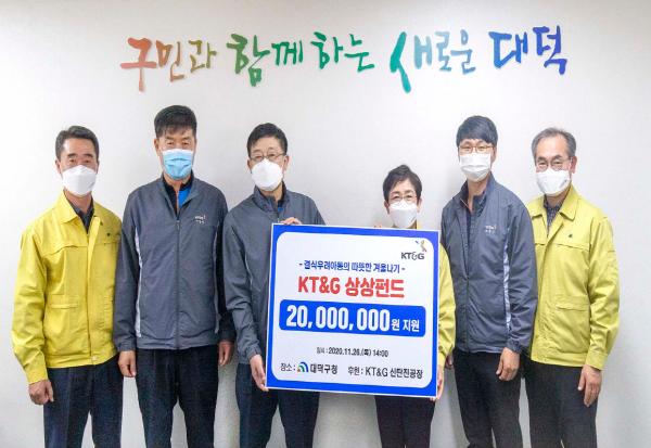 KT&G신탄진공장은 26일 코로나19 장기화와 동절기로 어려움을 겪을 결식 우려아동을 위해 ‘상상나눔 도시락지원’ 사업비 2000만원을 대덕구(구청장 박정현)에 기탁했다.