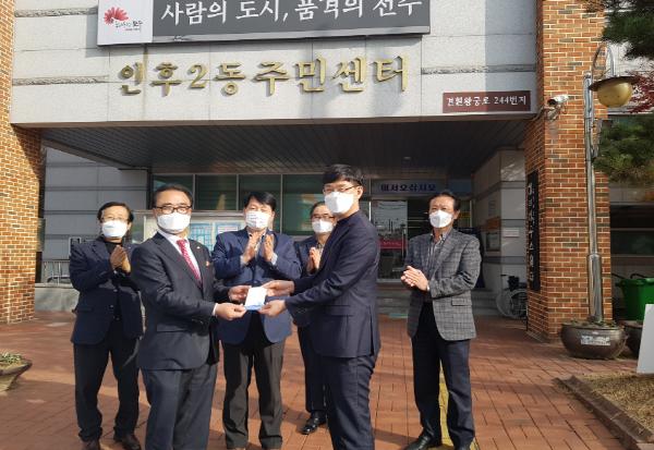 전주복지신협은 26일 인후2동 주민센터에 어려운 이웃을 위해 써달라며 성금 150만 원을 기탁했다.