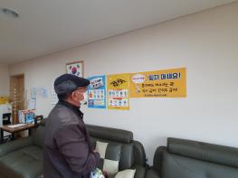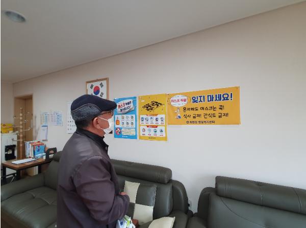 특히, 어르신들이 경로당에 들어서는 순간부터 경각심을 갖고 방역수칙을 철저히 준수 할 수 있도록 “마스크 착용, 잊지 마세요!”, “혼자 있을 때도 마스크는 꼭!”, “식사금지! 간식도 금지!” 라는 문구의 현수막을 큼지막하게 제작, 실내에 부착해드려 어르신들이 쉽게 보고 실천할 수 있도록 하였다.