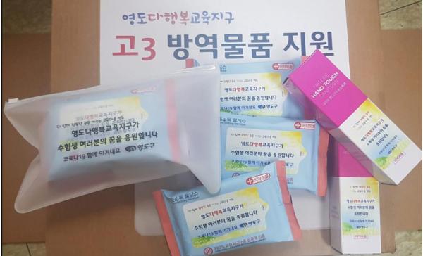 영도다행복교육지원센터는 코로나19 확산 장기화로 인한 어려움 속에서도 학업과 취업준비를 계속해온 학생들에게 힘이 되고자 손소독제와 손소독 티슈로 구성된 방역키트를 관내 6개 고등학교 3학년 학생 전체 750명을 대상으로 준비, 학교별로 전달했다