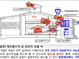 우선, 올해는 국비 23억 원을 투입하여 충남과 전남에서 선정한 마른 김 가공공장 10개소를 지원한 결과, 이달 말에 건조설비 설치사업이 준공되는 2개소를 비롯하여 올해 총 7개소에 건조설비 설치가 마무리된다. 마른 김 가공업체들이 통상 매년 11월부터 차년도 4월경까지 김을 가공하는 점을 고려했을 때, 올해 건조설비 설치가 완료되는 가공업체들은 건조설비 즉시 가동에 따른 경영비 절감이 이뤄질 것으로 기대하고 있다.