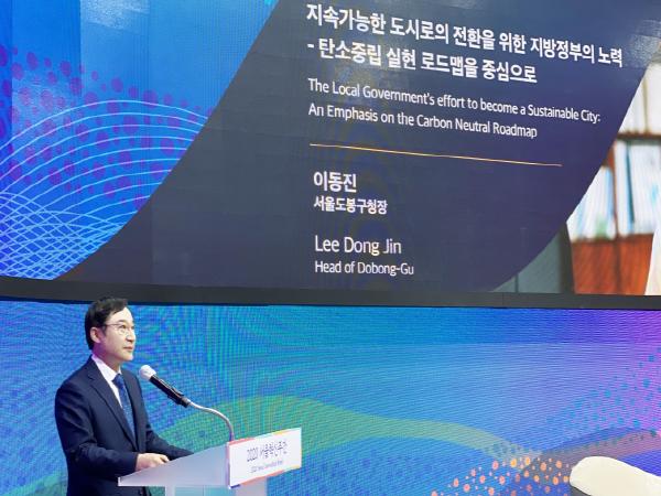 이번 포럼에서 이동진 도봉구청장은 ‘지속가능한 도시로의 전환을 위한 지방정부의 노력’이라는 주제로 탄소중립, 그린뉴딜, 환경 문제 등과 코로나 시대에 있어서 지방정부 역할과 다양한 정책 도전에 대해 소개했다.