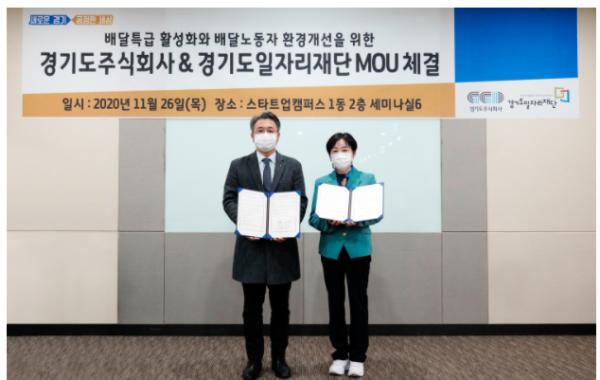 경기도주식회사는 26일 경기도일자리재단과 ‘배달특급’ 활성화와 배달노동자 환경 개선을 위한 업무협약을 체결하고 상호 지원하기로 약속했다.