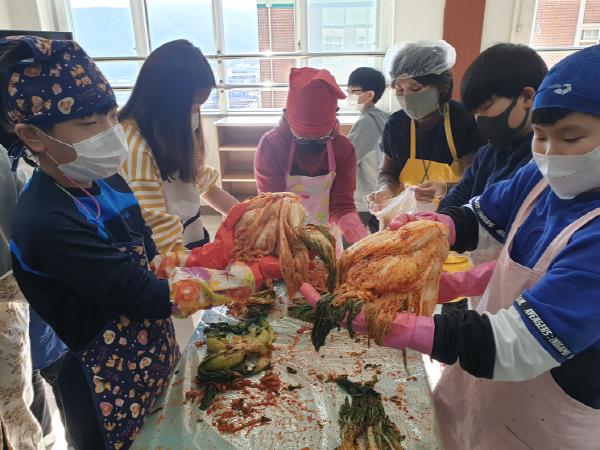 아이들은 이름까지 지어준 배추를 제 손으로 직접 수확을 하며 깨끗하게 씻어 소금물에 절이는 작업부터 시작하였다. 다음날 소금에 절여놓은 배추를 헹구어 배춧잎 한 장 한 장 꼼꼼하게 양념에 버무렸다. 아이들은 “저는 김장을 태어나서 처음해봐요”, “할머니집에서 김장을 해봤어요”, “이제는 매운 김치도 잘먹을수 있을꺼 같아요”라고 말했다. 허하율 학생은 “엄마가 김장을 하실 때 너무 힘드실꺼 같아요 다음번에는 제가 많이 도와드릴수 있을꺼 같아요.”라고 했다.