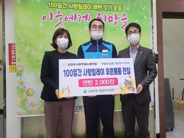 의정부시공무원노동조합과 NH농협은행 의정부시지사가 11월 26일 연탄 2천장을 호원2동에 기부했다고 밝혔다.