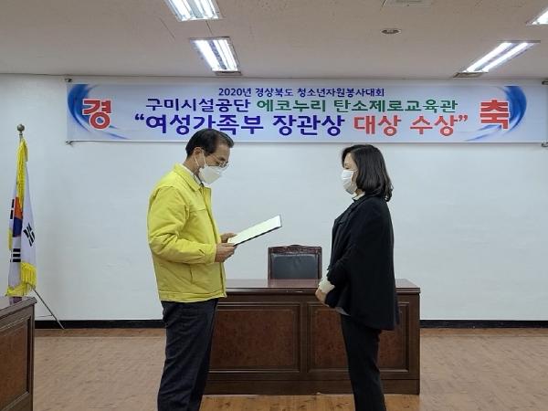 구미시설공단 에코누리 탄소제로교육관이 경상북도 청소년활동진흥센터 주관 2020년 청소년자원봉사 활동터전 ’최우수 터전’으로 선정되어 여성가족부 장관상 대상을 수상했다.