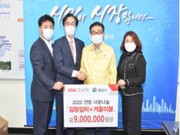 BNK경남은행은 27일 연말 사랑나눔 사업으로 양산시에 900만원 상당의 김장김치(134박스)와 겨울이불(77채)을 기탁했다.