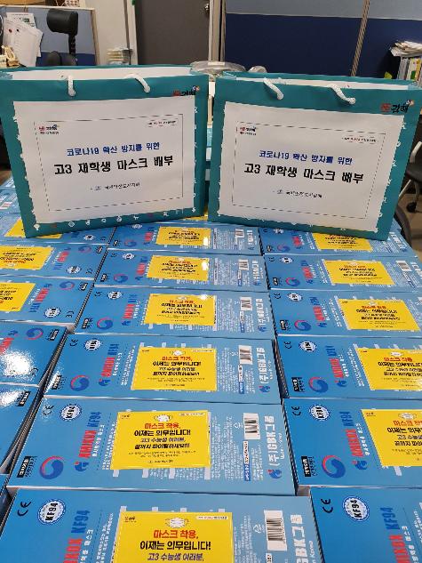시는 관내 24개 고등학교 고3 수험생 전 학급에 KF94 마스크 5,300매를 전달했고 17개 각 고사장마다 코로나 상황을 이겨내고 그간의 노력이 빛을 발하길 바라는 허성곤 시장의 격려 메시지를 담은 현수막을 달아 수험생들을 격려하고 있다.