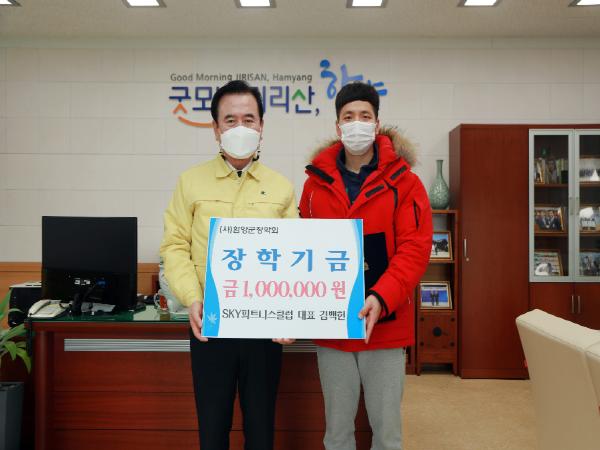 함양군은 27일 SKY피트니스클럽 김백헌 대표가 함양군청을 찾아 지역 인재의 건강한 성장을 기원하는 마음을 담아 (사)함양군장학회에 장학금 100만원을 기탁했다고 밝혔다.