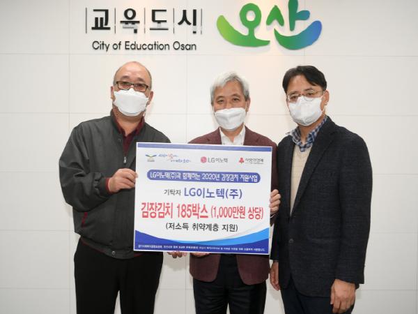 오산시는 지난 11월 26일 LG이노텍(주)(노조지부장 장대식)에서 시청을 방문해 관내 저소득 가구를 대상으로 김장김치 185박스를 기탁했다고 밝혔다.