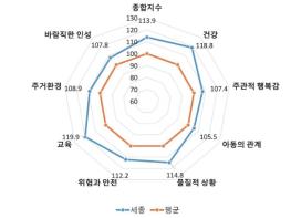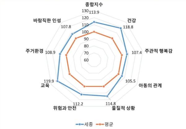 세종시의 영역별 점수는 ▲건강 118.8 ▲주관적 행복감 107.4 ▲아동의 관계 105.5 ▲물리적 상황 114.8 ▲위험과 안전 112.2 ▲교육 119.9 ▲주거환경 108.9 ▲바람직한 인성 107.8으로 확인됐다.