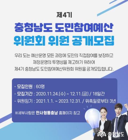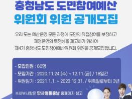 충남도는 ‘제4기 충남도 도민참여예산위원회’에 참여할 위원을 공개 모집한다고 29일 밝혔다.