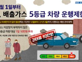 올해 12월부터 내년 3월까지 ‘미세먼지 계절관리제’ 기간 동안 배출가스 5등급 차량 중 저공해조치를 하지 않은 차량은 평일 오전 6시부터 오후 9시까지 도내 운행이 금지된다. 단속에 적발될 경우 도 조례에 따라 10만원의 과태료가 부과된다.