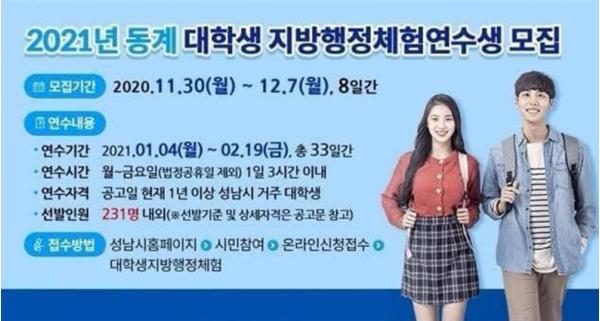 성남시는 11월 30일~12월 7일 ‘2021년 동계 대학생 지방행정 체험 연수’ 희망자 231명을 모집한다.