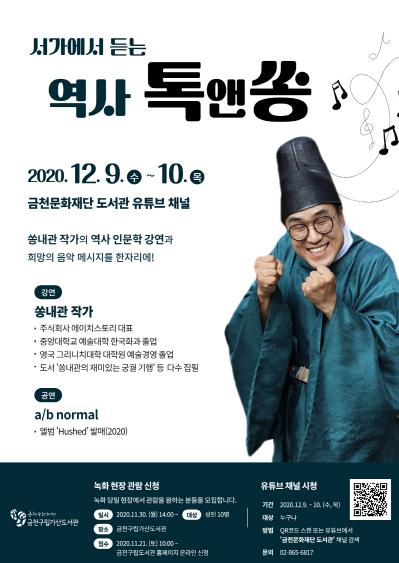 금천문화재단은 12월 9일(수)~10일(목) 금천구립가산도서관에서 쏭내관 작가와 함께하는 ‘서가에서 듣는 역사 톡앤쏭’을 진행한다고 밝혔다.