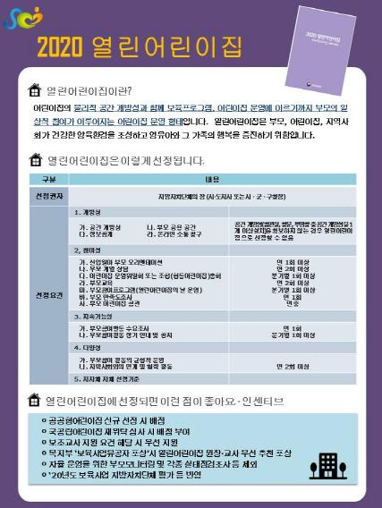 열린어린이집은 어린이집 공간, 프로그램 및 운영에 부모의 일상적 참여를 확대하여 부모·어린이집·지역사회가 더불어 건강한 양육환경을 만들기 위한 것으로 34개소(국공립 29개소, 민간 3개소, 가정 2개소)가 올해 열린어린이집으로 선정되었으며,
