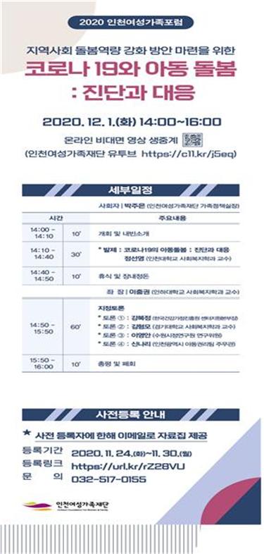 인천여성가족재단에서는 12월 1일 오후 2시에 ‘2020 인천여성가족포럼'을 개최한다. 이번 행사는 코로나19 확산 방지를 위해 인천여성가족재단 유튜브채널을 통해 온라인으로 생중계한다.