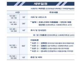 발제를 맡은 정선영 교수(인천대학교)는 코로나19 이후 중앙정부의 아동 돌봄정책과 함께 인천시의 아동 돌봄 현황에 대해 발표한다. 아울러 토론자로 나선 강복정 센터지원본부장(한국건강가정진흥원), 김형모 교수(경기대학교), 이영안 연구위원(수원시정연구원), 신나리 주무관(인천광역시 아동권리팀)으로부터 중앙과 서울 등 타지역 아동 돌봄정책 추진 현황과 인천시 돌봄정책의 향후 과제에 대해 집중 토론할 계획이다. 본 토론은 이충권 교수(인하대학교)가 좌장을 맡았다.