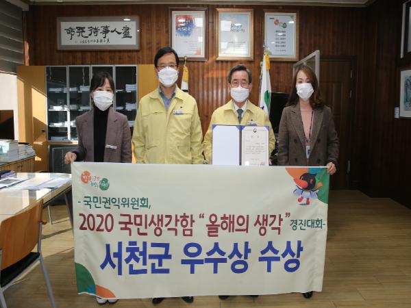 서천군이 국민권익위원회에서 주관한 ‘2020년 국민생각함 올해의 생각’ 공모전에서 기관 부문 우수상을 수상했다고 30일 밝혔다.