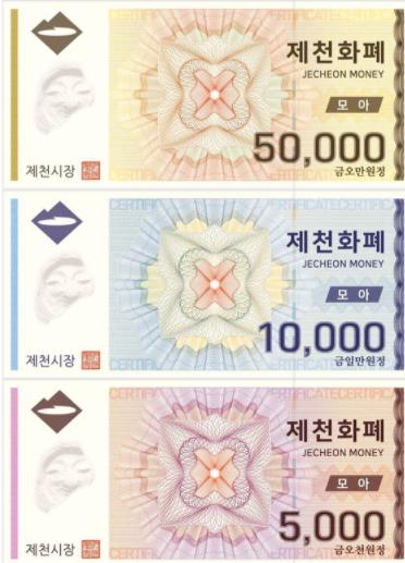 제천시는 지류형, 카드형, 모바일형으로 올해 1,455억원 규모의 제천화폐를 발행하여 유통하였으며, 내년에도 1,000억 원 규모의 제천화폐를 발행할 예정이다.