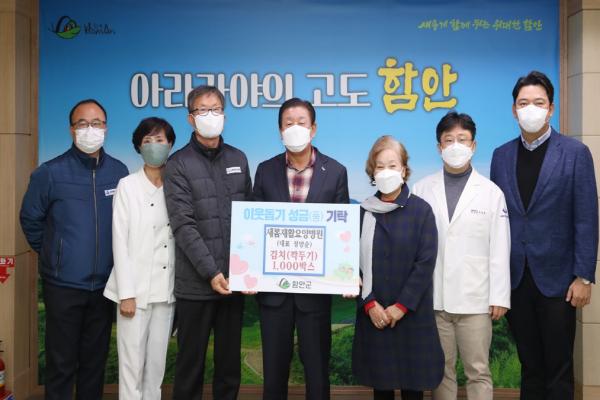 함안군 새롬요양병원(이사장 정양순)은 30일 군청을 방문하여 어려운 이웃에게 전달해 달라며 깍두기 김치 1,000박스(2,000만 원 상당)를 기탁했다.