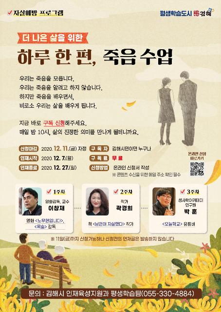 김해시는 자살예방, 생명존중 교육의 새로운 접근방향을 제시하고자 12월 7일부터 죽음을 배우며, 삶을 다시 바라보는 ‘하루 한 편, 죽음 수업’ 구독 프로그램을 실시한다고 밝혔다.