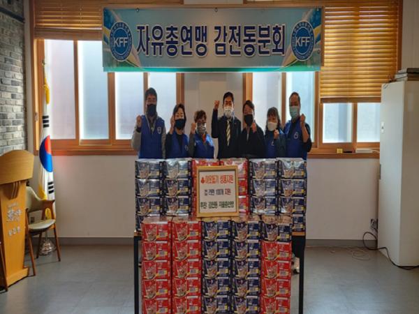 부산시 사상구 감전동 자유총연맹지도위원회는 지난 27일 취약계층을 위해 컵라면 6개입 100개를 감전동행정복지센터에 전달하였다.