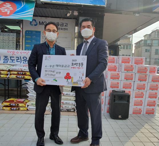 e-푸른 새마을금고(본점)는 사회공헌 활동인 사랑의 좀도리운동의 일환으로 쌀(20kg), 김치(8kg) 100여개를 기증하였으며, 어려운 이웃들의 겨울나기에 도움이 되길 바란다는 뜻을 전달하였다.