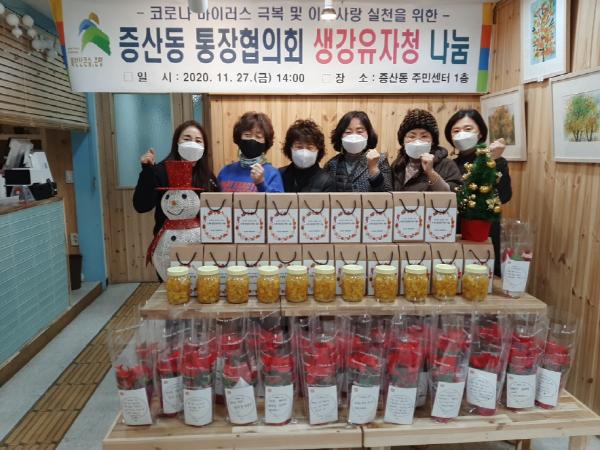 은평구 증산동주민센터(동장 주미정)는 11월 27일(금) 14시 증산동 통장협의회(회장 최서원)주관으로 생강유자청 전달식을 열었다.