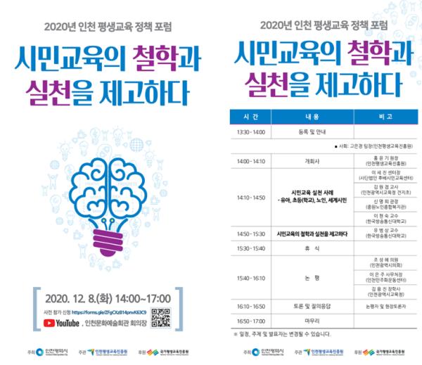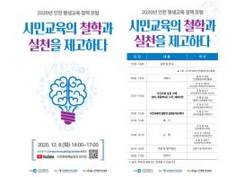 인천평생교육진흥원은 12월 8일(화) 14시, 인천문화예술회관 회의장에서 「시민교육의 철학과 실천을 제고하다」라는 주제로 2020년 인천광역시 평생교육 정책 포럼을 개최한다. 이번 정책 포럼에서는 작년 포럼에 이어 민주시민교육의 정착과 활성화를 위한 정책 방향을 모색하고자 한다.