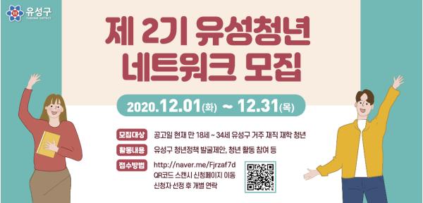 대전 유성구는 청년들의 참신한 아이디어를 구정에 반영하기 위해 2021년에 활동할 ‘제2기 유성청년네트워크’ 참여 위원을 모집한다고 1일 밝혔다.
