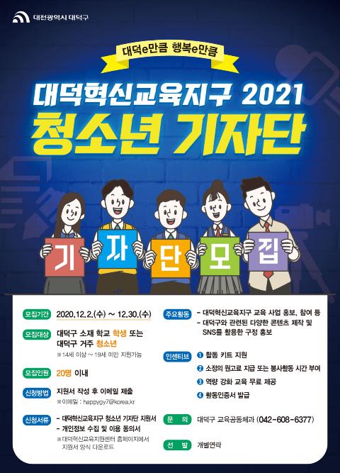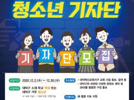 대전 대덕구는 오는 30일까지 지역 내 학교 학생 또는 거주 청소년(14세 이상 ~ 19세 미만)을 대상으로 2021년 대덕혁신교육지구 청소년 기자단을 모집한다.